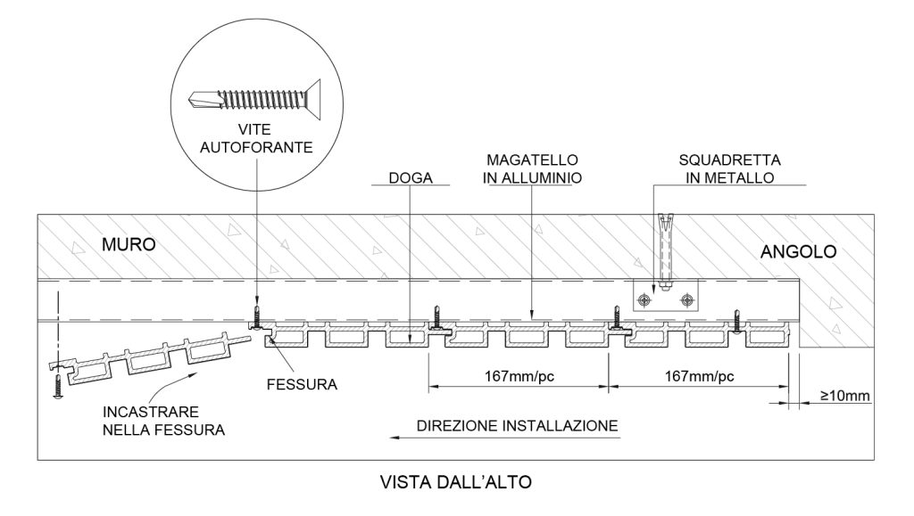 Il fissaggio delle doghe avviene mediante avvitatura diretta sul magatello, utilizzando viti autoforanti in acciaio.